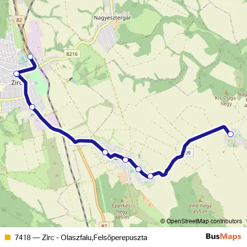 The first stop of the 7418 bus route is Olaszfalu, Felsőperepuszta and the last stop is Zirc, autóbusz-állomás (vasútállomás). 7418 (Zirc - Olaszfalu,Felsőperepuszta) is operational during everyday.