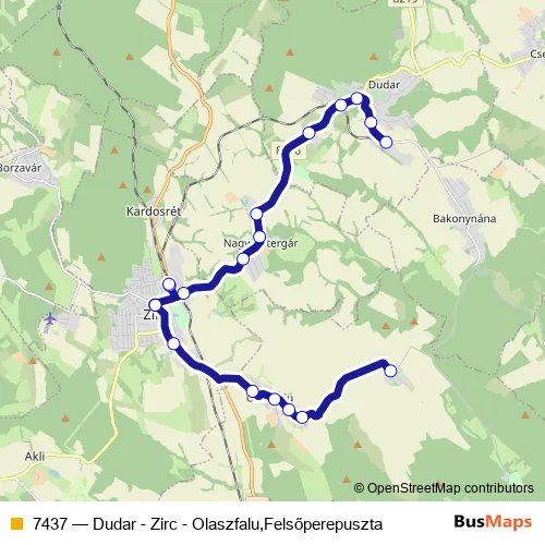 The first stop of the 7437 bus route is Dudar, bánya and the last stop is Olaszfalu, Felsőperepuszta. 7437 (Dudar - Zirc - Olaszfalu,Felsőperepuszta) is operational during on weekdays.