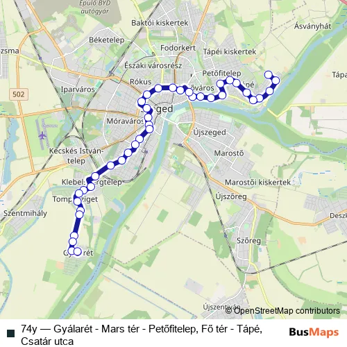 Click here to view the nearest 74y - Gyálarét - Mars tér - Petőfitelep, Fő tér - Tápé, Csatár utca bus stop.