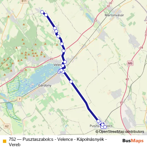The first stop of the 752 bus route is Pusztaszabolcs, templom and the last stop is Vereb, Szabadság tér. 752 (Pusztaszabolcs - Velence - Kápolnásnyék - Vereb) is operational during on weekdays.