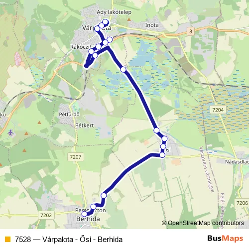 The first stop of the 7528 bus route is Berhida, autóbusz-váróterem and the last stop is Várpalota, autóbusz-állomás. 7528 (Várpalota - Ősi - Berhida) is operational during on weekdays.