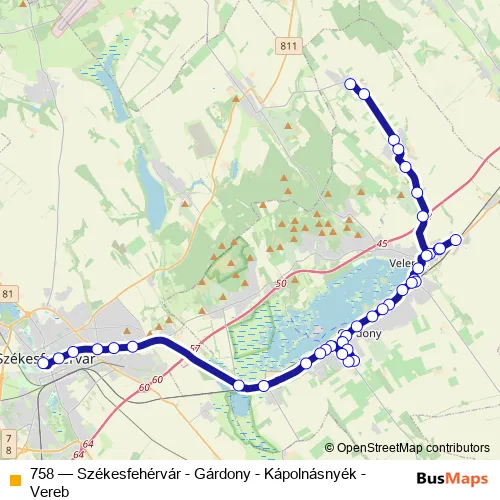 The first stop of the 758 bus route is Vereb, Szabadság tér and the last stop is Agárd, gyógyfürdő. 758 (Székesfehérvár - Gárdony - Kápolnásnyék - Vereb) is operational during everyday.