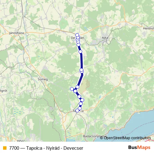 The first stop of the 7700 bus route is Nyirád, autóbusz-forduló and the last stop is Devecser, vasútállomás. 7700 (Tapolca - Nyirád - Devecser) is operational during everyday.