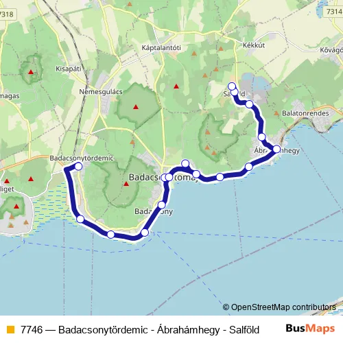 The first stop of the 7746 bus route is Badacsonytördemic, Hősök útja 6. and the last stop is Salföld, autóbusz-forduló. 7746 (Badacsonytördemic - Ábrahámhegy - Salföld) is operational during on weekdays.