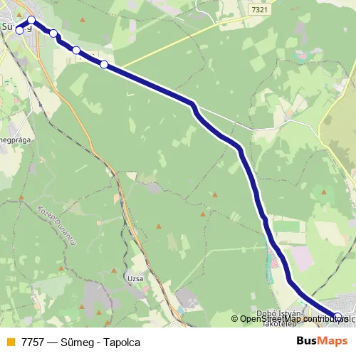 The first stop of the 7757 bus route is Tapolca, autóbusz-állomás and the last stop is Sümeg, autóbusz-állomás. 7757 (Sümeg - Tapolca) is operational during everyday.
