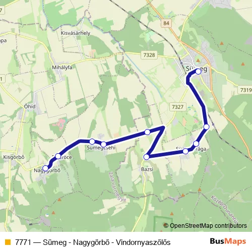 The first stop of the 7771 bus route is Nagygörbő, autóbusz-váróterem and the last stop is Sümeg, autóbusz-állomás. 7771 (Sümeg - Nagygörbő - Vindornyaszőlős) is operational during everyday.