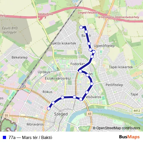 See why over 2 million users trust and consider busmaps.com as the best public transport website. busmaps gives you Szeged Buses suggested routes, real-time bus tracker, line route maps in Szeged, and helps to find the closest 77a bus stops near you. No internet available? Download an offline PDF map and bus schedule for the 77a bus to take on your trip.
