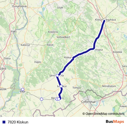 The first stop of the 7820 Kiskun rail route is Baja and the last stop is Jánoshalma. 7820 Kiskun is operational during on weekdays.
