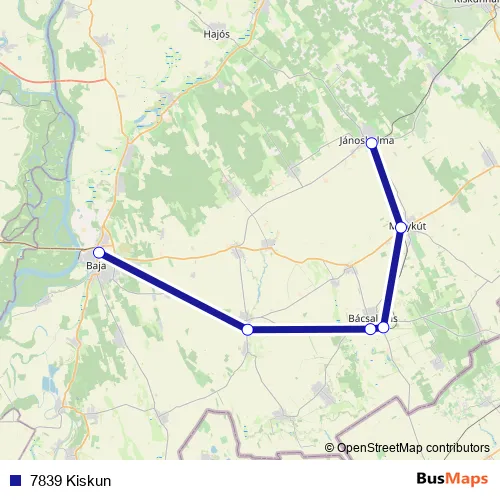 The first stop of the 7839 Kiskun rail route is Jánoshalma and the last stop is Baja. 7839 Kiskun is operational during on weekdays.