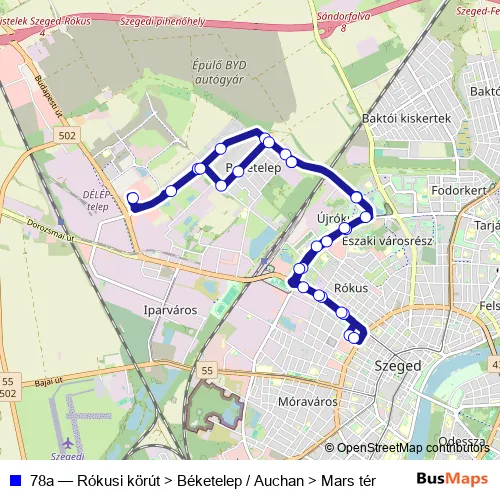 The first stop of the 78a bus route is Mars tér (üzletsor) and the last stop is Mars tér (üzletsor). 78a (Rókusi körút > Béketelep / Auchan > Mars tér) is operational during everyday.
