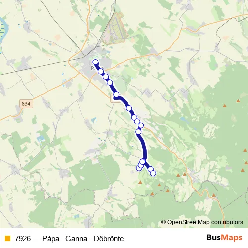 The first stop of the 7926 bus route is Pápa, autóbusz-állomás and the last stop is Döbrönte, autóbusz-váróterem. 7926 (Pápa - Ganna - Döbrönte) is operational during everyday.