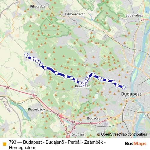 The first stop of the 793 bus route is Budapest, Széll Kálmán tér and the last stop is Budajenő, Petőfi Sándor utca. 793 (Budapest - Budajenő - Perbál - Zsámbék - Herceghalom) is operational during on weekdays.