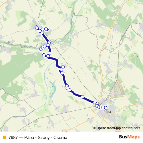 The first stop of the 7987 bus route is Szany, kastély and the last stop is Pápa, autóbusz-állomás. 7987 (Pápa - Szany - Csorna) is operational during on weekdays.