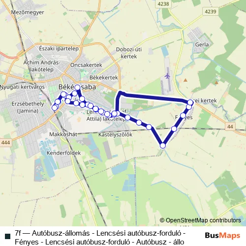 The first stop of the 7f bus route is Békéscsaba, autóbusz-állomás and the last stop is Békéscsaba, autóbusz-állomás. 7f (Autóbusz-állomás - Lencsési autóbusz-forduló - Fényes - Lencsési autóbusz-forduló - Autóbusz - állo) is operational during everyday.