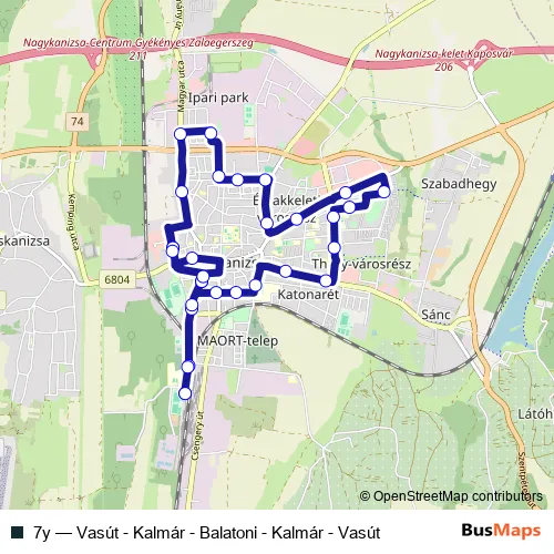 The first stop of the 7y bus route is Nagykanizsa, vasútállomás and the last stop is Nagykanizsa, vasútállomás. 7y (Vasút - Kalmár - Balatoni - Kalmár - Vasút) is operational during everyday.