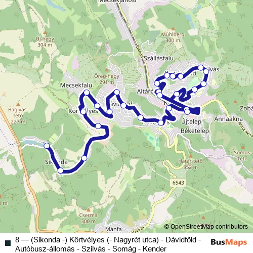 Bus 8 - (Sikonda -) Körtvélyes (- Nagyrét utca) - Dávidföld - Autóbusz-állomás - Szilvás - Somág - Kender in Komlo: Stops & Timetable