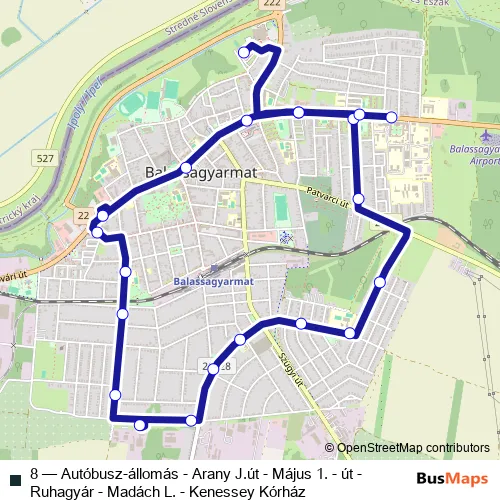 The first stop of the 8 bus route is Balassagyarmat, autóbusz-állomás and the last stop is Balassagyarmat, Kenessey Albert Kórház. 8 (Autóbusz-állomás - Arany J.út - Május 1. - út - Ruhagyár - Madách L. - Kenessey Kórház) is operational during everyday.