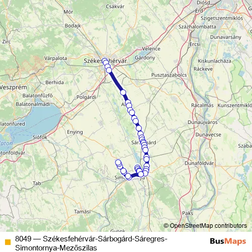 The first stop of the 8049 bus route is Székesfehérvár, autóbusz-állomás and the last stop is Mezőszilas, Mártírok útja. 8049 (Székesfehérvár-Sárbogárd-Sáregres-Simontornya-Mezőszilas) is operational during everyday.
