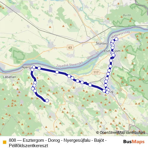 The first stop of the 808 bus route is Esztergom, Dobozi Mihály utca and the last stop is Péliföldszentkereszt. 808 (Esztergom - Dorog - Nyergesújfalu - Bajót - Péliföldszentkereszt) is operational during everyday.