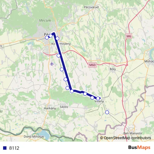 The first stop of the 8112 rail route is Pécs and the last stop is Magyarbóly. 8112 is operational during everyday.