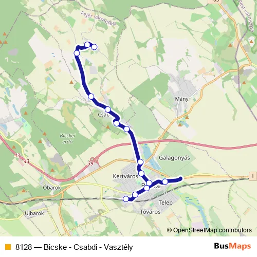 The first stop of the 8128 bus route is Csabdi, Vasztély and the last stop is Bicske, vasútállomás. 8128 (Bicske - Csabdi - Vasztély) is operational during everyday.