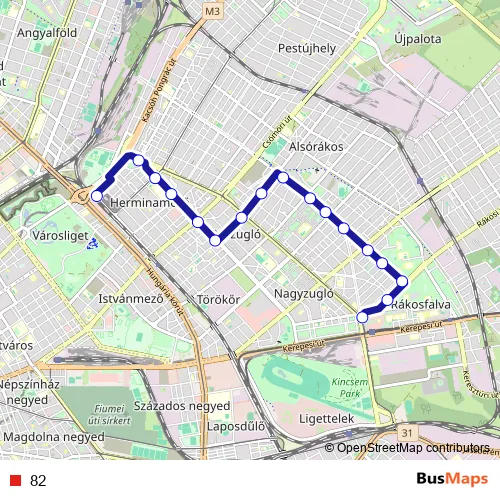 The first stop of the 82 trolleybus route is Mexikói út M and the last stop is Örs vezér tere M+H. 82 is operational during everyday.