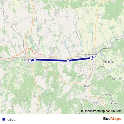 The first stop of the 8208 rail route is Dombóvár and the last stop is Kaposvár. 8208 is operational during everyday.