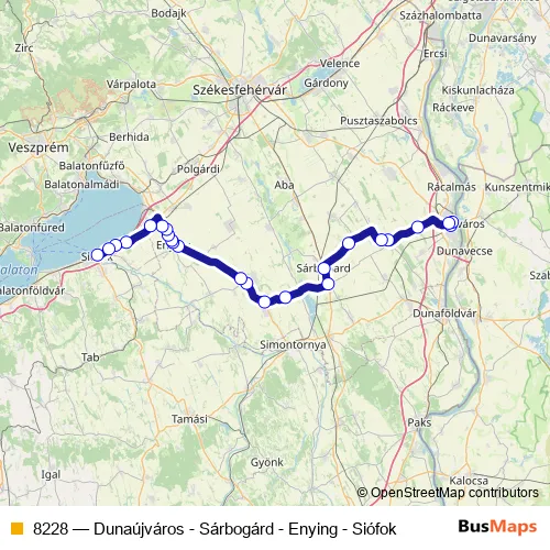 The first stop of the 8228 bus route is Dunaújváros, autóbusz-állomás and the last stop is Siófok, autóbusz-állomás. 8228 (Dunaújváros - Sárbogárd - Enying - Siófok) is operational during everyday.