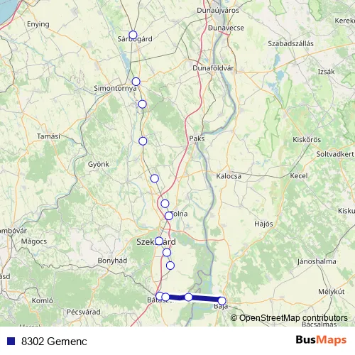 The first stop of the 8302 Gemenc rail route is Sárbogárd and the last stop is Baja. 8302 Gemenc is operational during on weekdays.