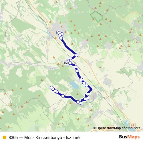 The first stop of the 8365 bus route is Mór, autóbusz-állomás and the last stop is Isztimér, tűzoltószertár. 8365 (Mór - Kincsesbánya - Isztimér) is operational during everyday.
