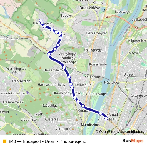 The first stop of the 840 bus route is Pilisborosjenő, autóbusz-forduló and the last stop is Budapest, Árpád híd autóbusz-állomás. 840 (Budapest - Üröm - Pilisborosjenő) is operational during everyday.