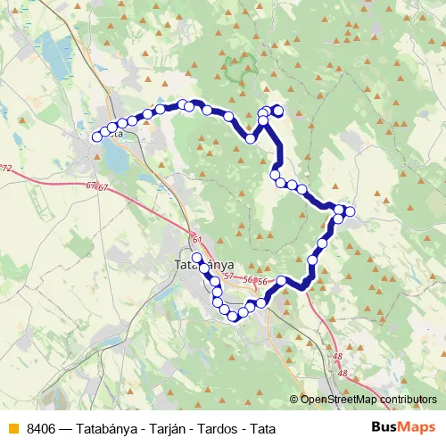 The first stop of the 8406 bus route is Tata, autóbusz-állomás and the last stop is Tatabánya, autóbusz-állomás. 8406 (Tatabánya - Tarján - Tardos - Tata) is operational during everyday.