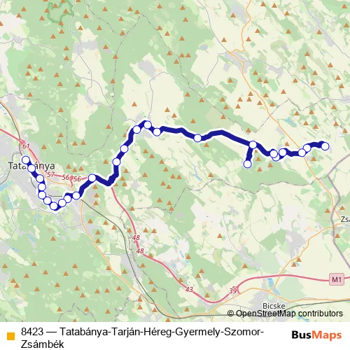 The first stop of the 8423 bus route is Somodorpuszta and the last stop is Tatabánya, autóbusz-állomás. 8423 (Tatabánya-Tarján-Héreg-Gyermely-Szomor-Zsámbék) is operational during everyday.
