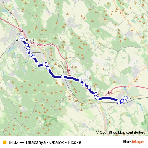 The first stop of the 8432 bus route is Tatabánya, autóbusz-állomás and the last stop is Bicske, Kossuth tér. 8432 (Tatabánya - Óbarok - Bicske) is operational during everyday.