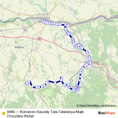 The first stop of the 8466 bus route is Komárom, autóbusz-állomás and the last stop is Kisbér, autóbusz-állomás. 8466 (Komárom-Naszály-Tata-Tatabánya-Majk-Oroszlány-Kisbér) is operational during everyday.
