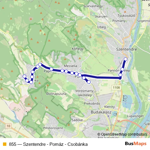 The first stop of the 855 bus route is Szentendre, autóbusz-állomás and the last stop is Csobánka, Plandics tér. 855 (Szentendre - Pomáz - Csobánka) is operational during everyday.
