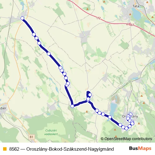 The first stop of the 8562 bus route is Nagyigmánd, Melkovicspuszta and the last stop is Szákszend, felső. 8562 (Oroszlány-Bokod-Szákszend-Nagyigmánd) is operational during everyday.