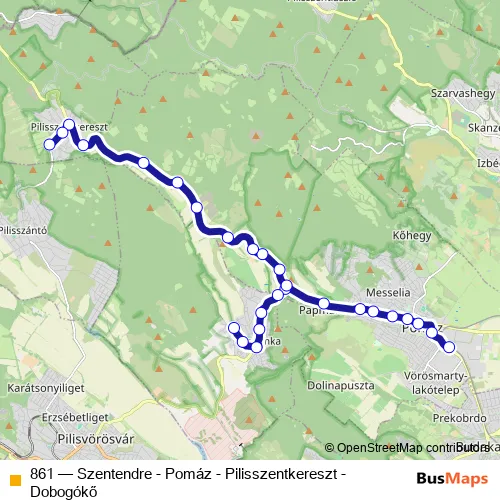 The first stop of the 861 bus route is Pomáz, autóbusz-állomás and the last stop is Pilisszentkereszt, autóbusz-forduló. 861 (Szentendre - Pomáz - Pilisszentkereszt - Dobogókő) is operational during everyday.