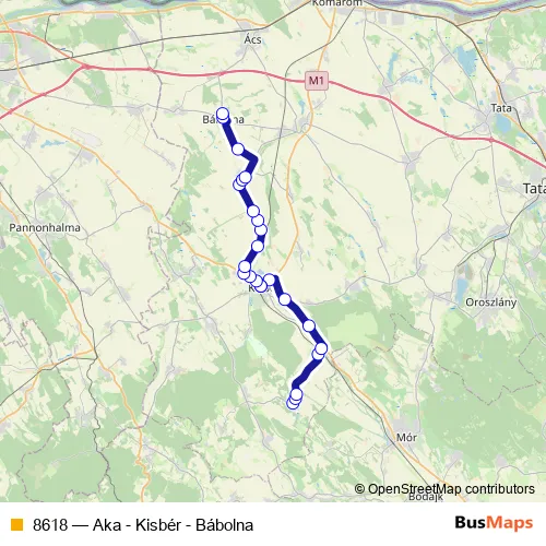 The first stop of the 8618 bus route is Aka, községháza and the last stop is Bábolna, autóbusz-forduló. 8618 (Aka - Kisbér - Bábolna) is operational during on weekdays.