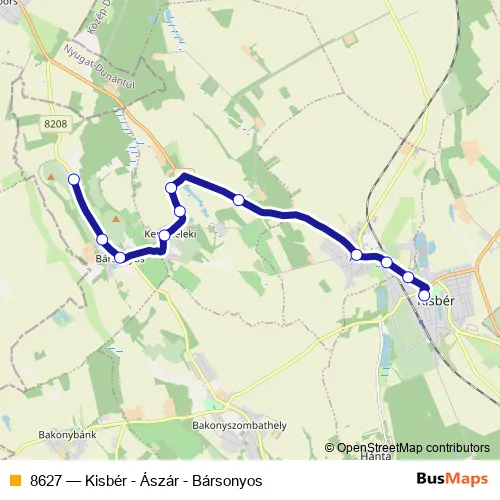 The first stop of the 8627 bus route is Bársonyos, Öreghegy and the last stop is Kisbér, autóbusz-állomás. 8627 (Kisbér - Ászár - Bársonyos) is operational during everyday.