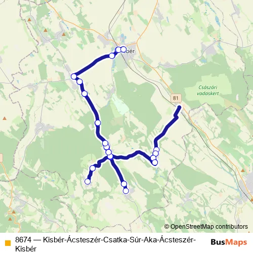 The first stop of the 8674 bus route is Kisbér, autóbusz-állomás and the last stop is Kisbér, autóbusz-állomás. 8674 (Kisbér-Ácsteszér-Csatka-Súr-Aka-Ácsteszér-Kisbér) is operational during on weekends.