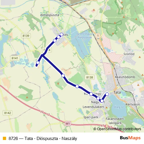 The first stop of the 8726 bus route is Naszály, községháza and the last stop is Tata, autóbusz-állomás. 8726 (Tata - Dióspuszta - Naszály) is operational during everyday.