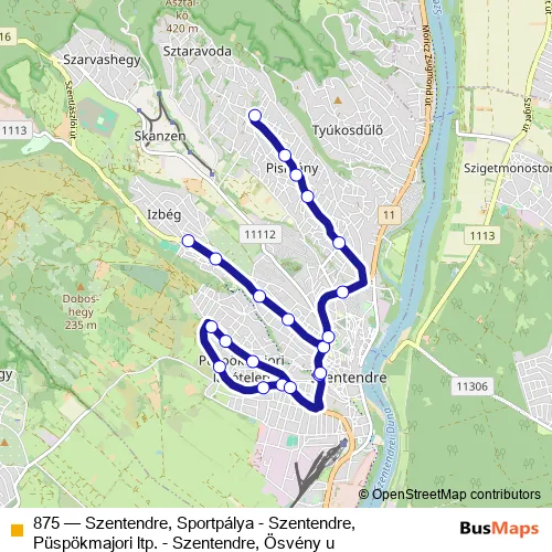 Bus 875 - Szentendre, Sportpálya - Szentendre, Püspökmajori ltp. - Szentendre, Ösvény u: Full Schedule in Szentendre