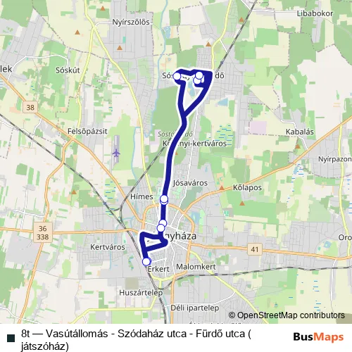 The first stop of the 8t bus route is Nyíregyháza, vasútállomás and the last stop is