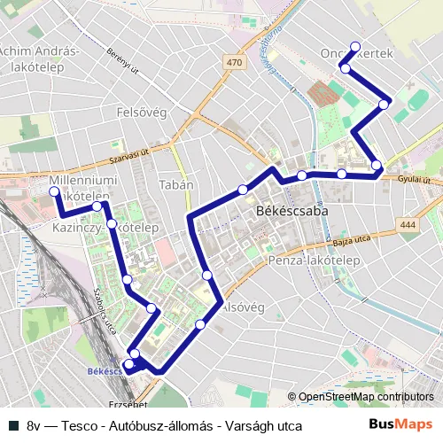 The first stop of the 8v bus route is Békéscsaba, Varságh utca and the last stop is Békéscsaba, Tesco. 8v (Tesco - Autóbusz-állomás - Varságh utca) is operational during everyday.