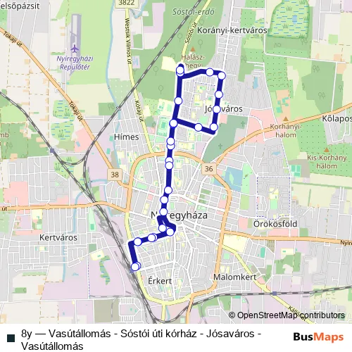 The first stop of the 8y bus route is Nyíregyháza, vasútállomás and the last stop is Nyíregyháza, vasútállomás. 8y (Vasútállomás - Sóstói úti kórház - Jósaváros - Vasútállomás) is operational during everyday.