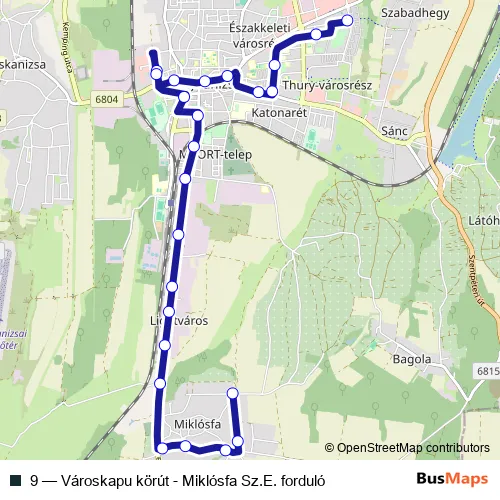 The first stop of the 9 bus route is Nagykanizsa, Városkapu körút and the last stop is Nagykanizsa (Miklósfa), Szentendrey Edgár autóbusz-forduló. 9 (Városkapu körút - Miklósfa Sz.E. forduló) is operational during everyday.