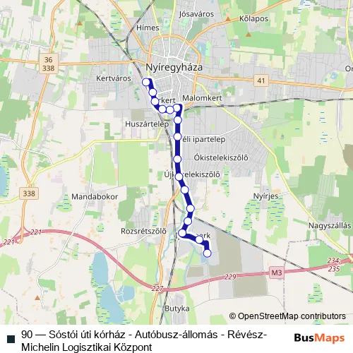 The first stop of the 90 bus route is Nyíregyháza, Ipari park, Boysen and the last stop is Nyíregyháza, autóbusz-állomás. 90 (Sóstói úti kórház - Autóbusz-állomás - Révész-Michelin Logisztikai Központ) is operational during on weekdays.