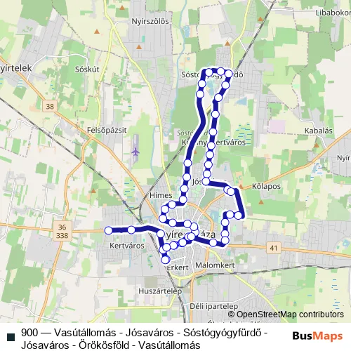 The first stop of the 900 bus route is Nyíregyháza, Szakiskola és Kollégium and the last stop is Nyíregyháza, vasútállomás. 900 (Vasútállomás - Jósaváros - Sóstógyógyfürdő - Jósaváros - Örökösföld - Vasútállomás) is operational during everyday.