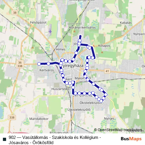 The first stop of the 902 bus route is Nyíregyháza, Szakiskola és Kollégium and the last stop is Nyíregyháza, vasútállomás. 902 (Vasútállomás - Szakiskola és Kollégium - Jósaváros - Örökösföld) is operational during everyday.